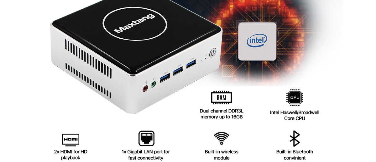 Maxtang MTN-BW50 is a small form factor PC with a tiny footprint based on the Intel Haswell and Broadwell Core™ processor, i5-4200U, i3-5005U, and i7-5500U. This mini PC squeeze a powerful processor, fast memory, and massive storage comparable to the full-size desktop PCs into the smallest form factors we can engineer. It puts full-sized PC power in the palm of your hand.