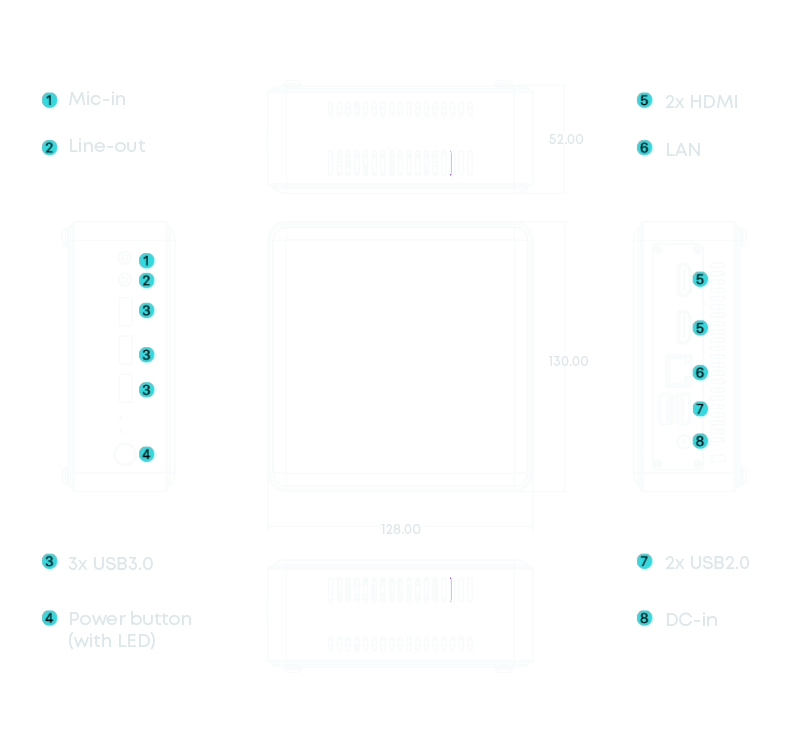 • Rich I/O ports: 3x USB3.0, 2x USB2.0, 1x LAN, 2x HDMI, 1x Line-out, 1x Mic-in, 1x DC-in