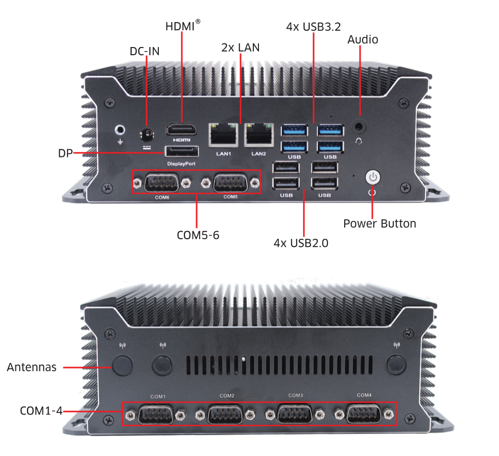 丰富的I/O接口:该MiniPC配备了HDMI、DP双显示接口,双千兆网口,6个串行端口和8个USB端口,满足各种外设连接需求,方便与外部设备的通信和扩展。