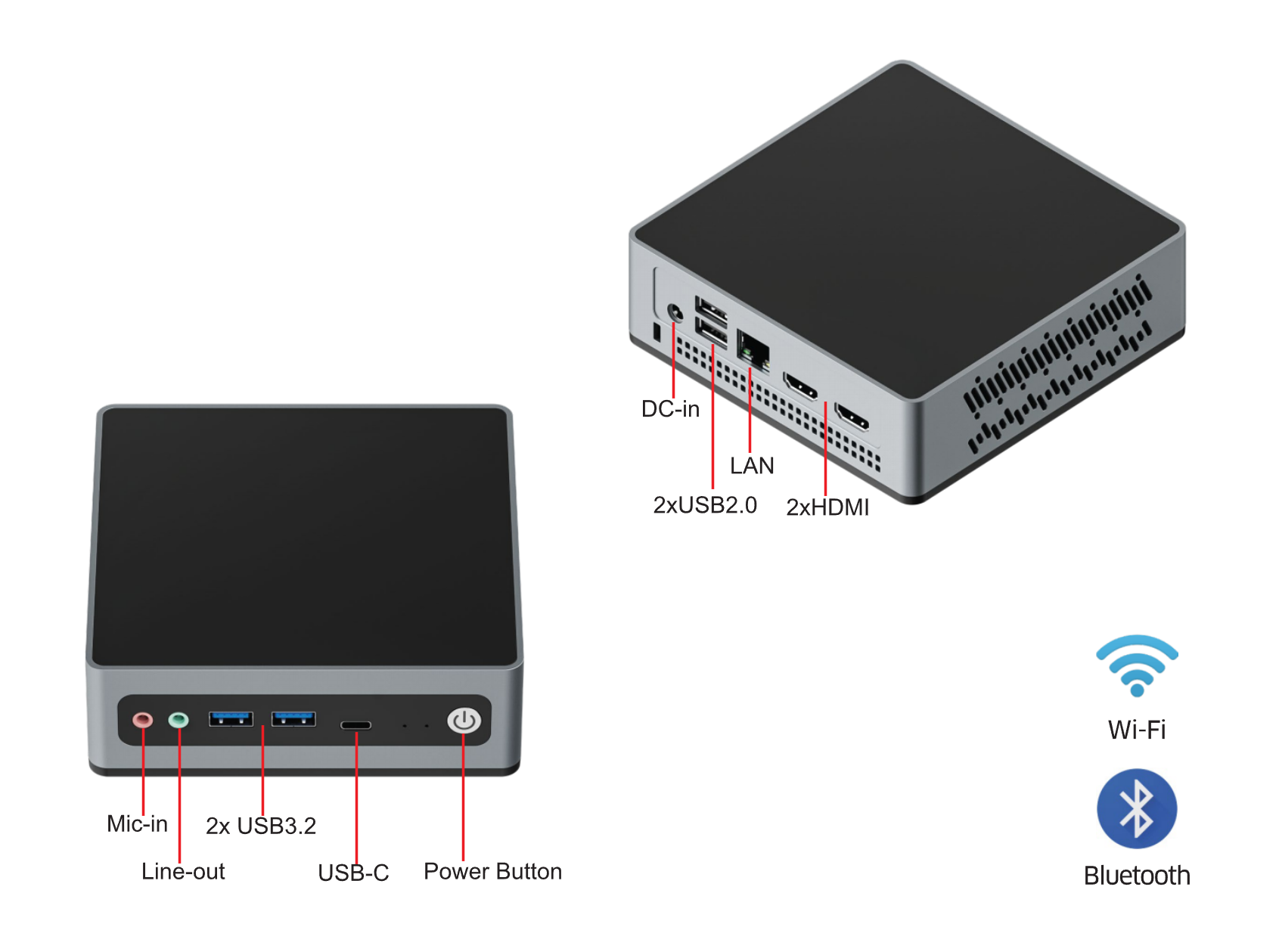 I/O Ports: 2xUSB3.2, 2xUSB2.0, 1xLAN, 2xHDMI, USB-C Gen2, Line-out, Mic-in,